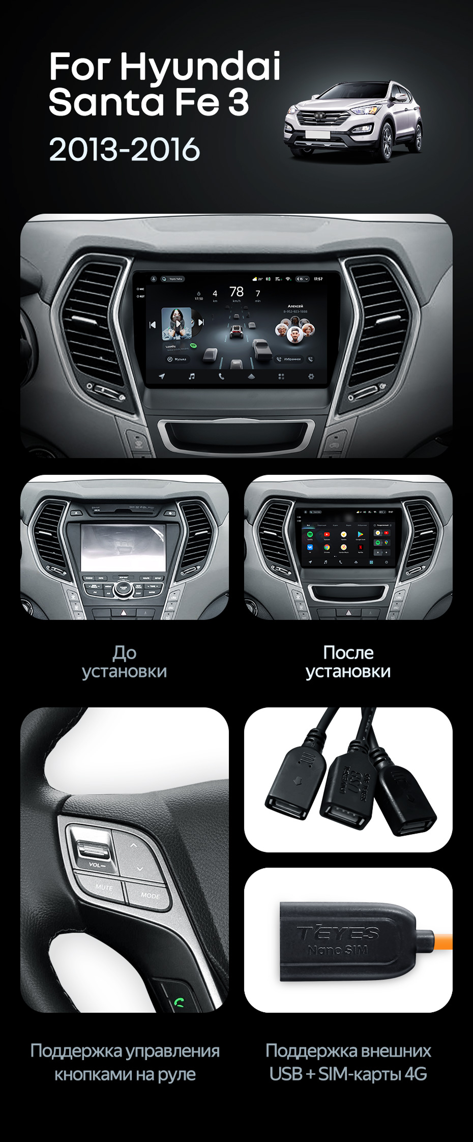 Штатная магнитола Teyes CC4 Pro 8/128 Hyundai Santa Fe 3 (2013-2016) Тип-B - купить всего за 58 900 руб. в интернет-магазине в Ангарске Teyes.com.ru. ✓ Самый лучший выбор мультимедиа ✓ Лучшая замена штатному ГУ ✓ Тел. +7 (800) 775-31-74