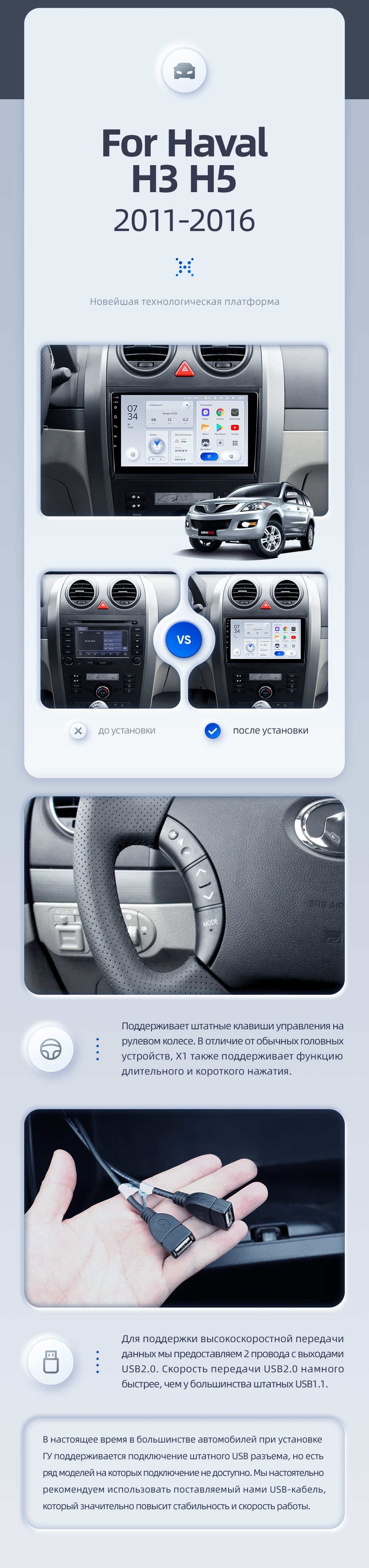 | USB | 3×USB 2.0 + USB 3.0 | Доп. аксессуары | Передняя/задняя AHD-камера, DVR-регистратор, TPMS, парковочный OBD, Type-C → HDMI |
