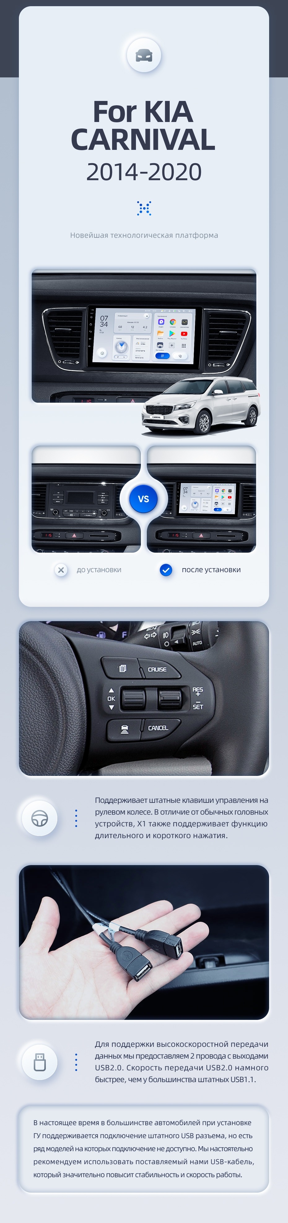 | USB | 3×USB 2.0 + USB 3.0 | Доп. аксессуары | Передняя/задняя AHD-камера, DVR-регистратор, TPMS, парковочный OBD, Type-C → HDMI |