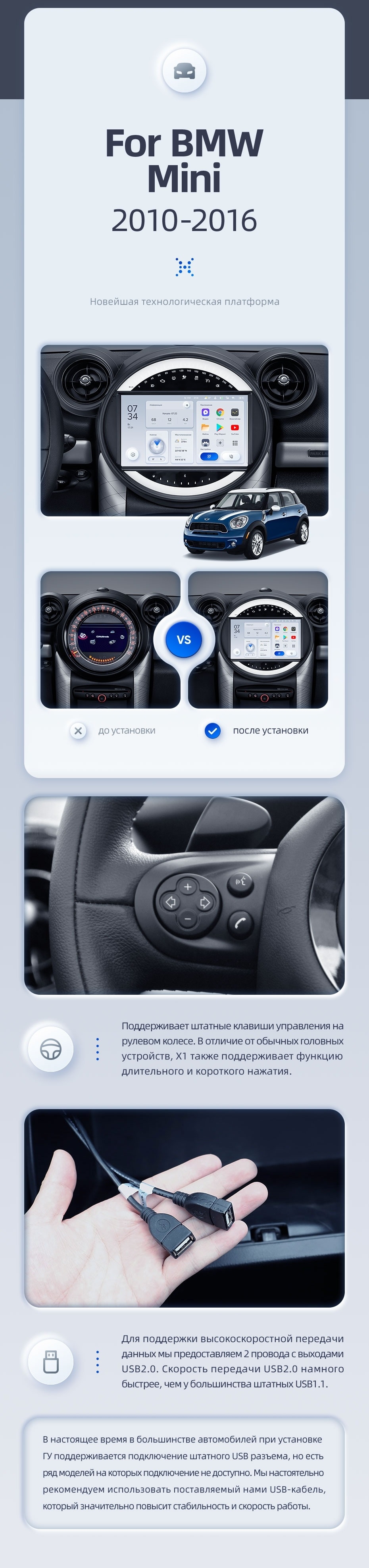| USB | 3×USB 2.0 + USB 3.0 | Доп. аксессуары | Передняя/задняя AHD-камера, DVR-регистратор, TPMS, парковочный OBD, Type-C → HDMI |
