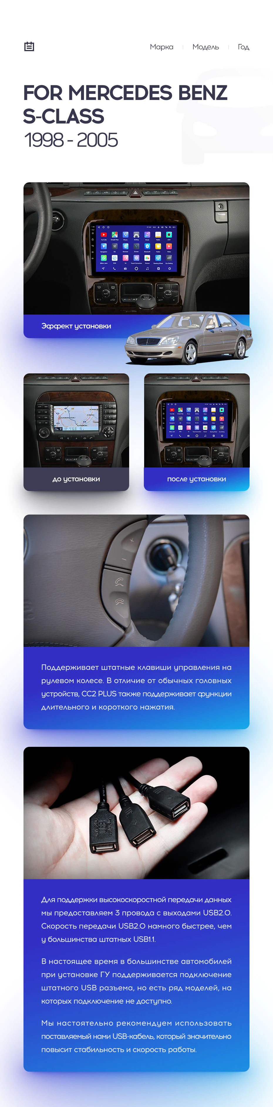 Полный комплект установки магнитолы Teyes с рамкой и проводкой можно выбрать в каталоге штатных магнитол Mercedes Benz S-Class W220 VV220 (1998-2005).