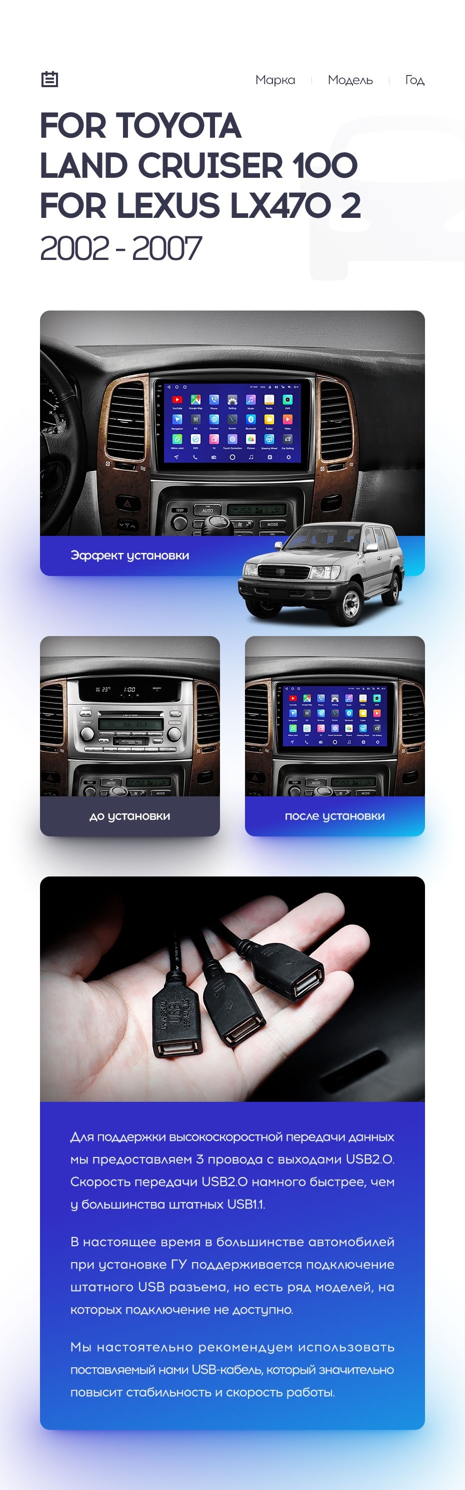 Полный комплект установки магнитолы Teyes с рамкой и проводкой можно выбрать в каталоге штатных магнитол Toyota Land Cruiser LC 100 (2002-2007).